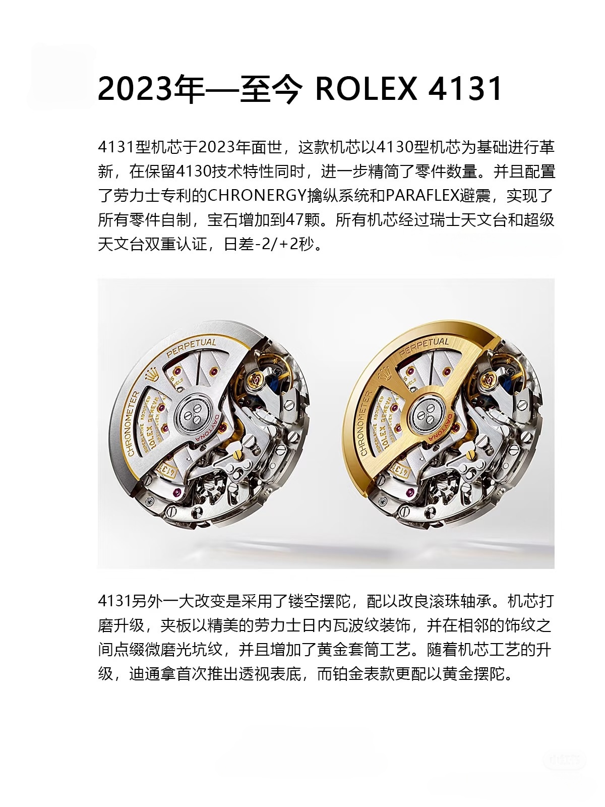 劳力士 4131 机芯是劳力士于 2023 年推出的一款自动上链计时机芯,为宇宙计型迪通拿系列的专属机芯Rolex Newsroom:
