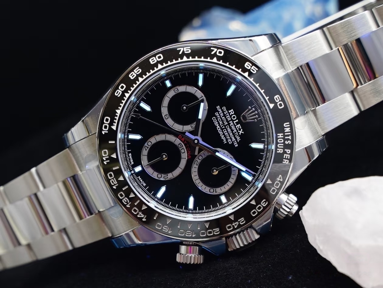 表盘的设计则暗藏巧思,经典的黑色漆面表盘搭配白色夜光时标与指针,延续了迪通拿系列辨识度极高的“熊猫”布局,却以全黑底色赋予其更沉稳的气场。时标与指针均填充了劳力士自家研发的Chromalight夜光物料,在黑暗中能发出持久的蓝色光芒,既保证了夜间读时的清晰,又为腕表增添了一抹神秘的科技感。值得一提的是,表盘上的“Daytona”字样采用立体印刷工艺,边缘锐利、质感饱满,细节处尽显品牌对品质的极致追求。