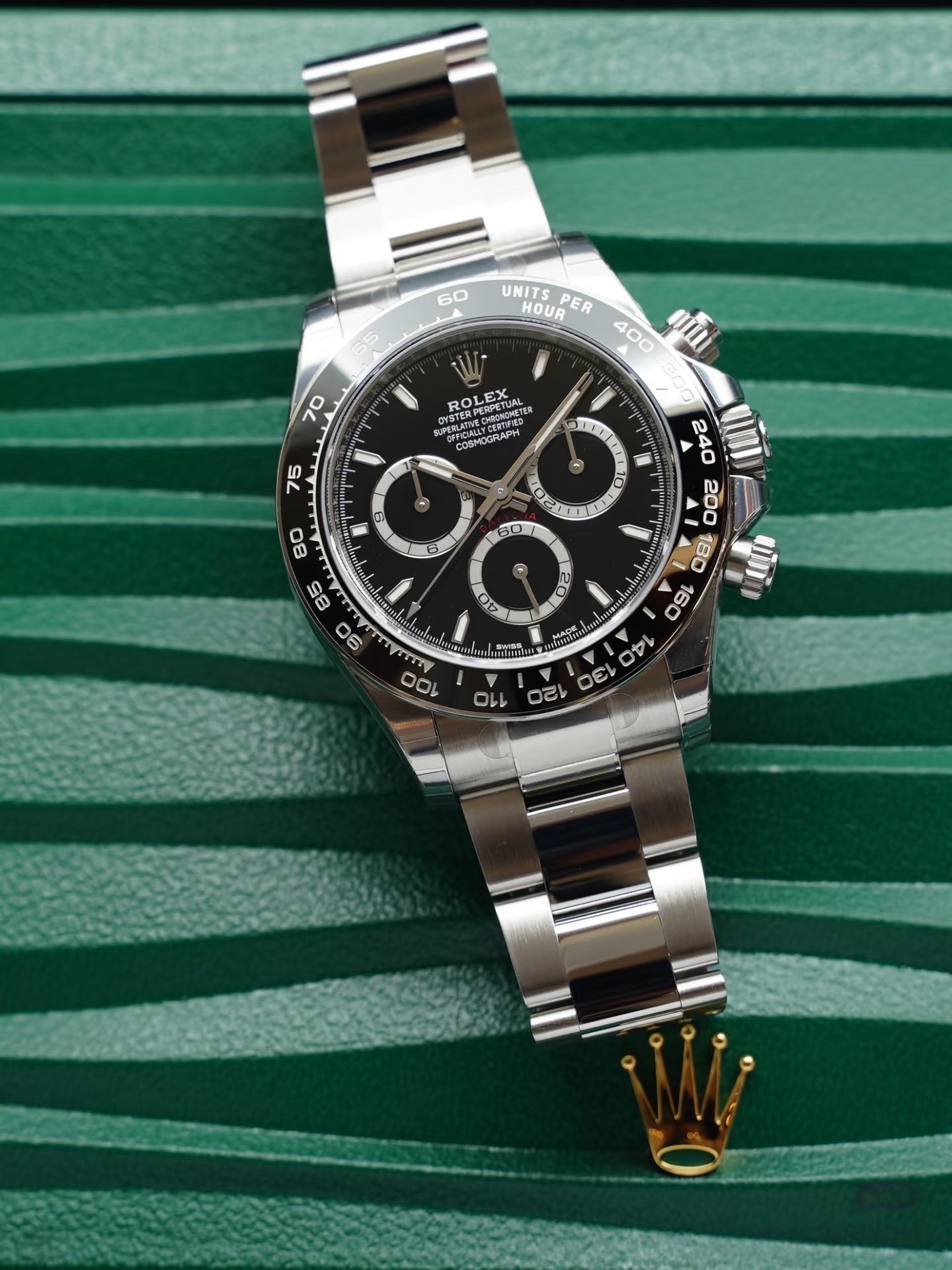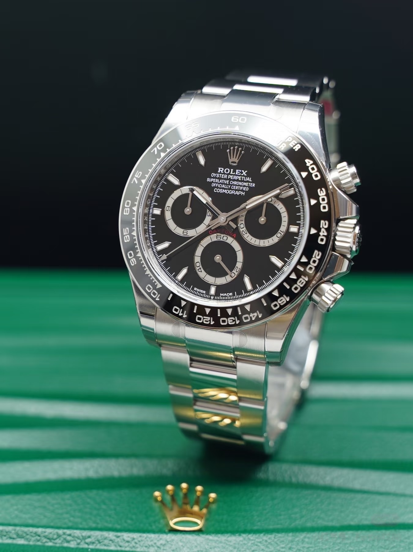 腕表采用40毫米蚝式表壳,搭载904L蚝式钢材质,抗腐蚀、耐磨损,表耳经精细打磨收窄,弧度更贴合手腕,表壳厚度优化至11.9毫米,上手轻盈无压腕感,适配多数亚洲人腕围。标志性的黑色Cerachrom陶瓷表圈,采用先进PVD镀铂工艺,镌刻清晰测速刻度,莫氏9级硬度可有效抵御刮擦,色彩持久不易褪色,光线照射下尽显细腻光泽。