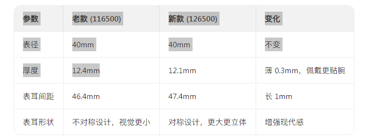 新款 (126500LN):2023 年接替上市,延续经典设计但细节全面升级