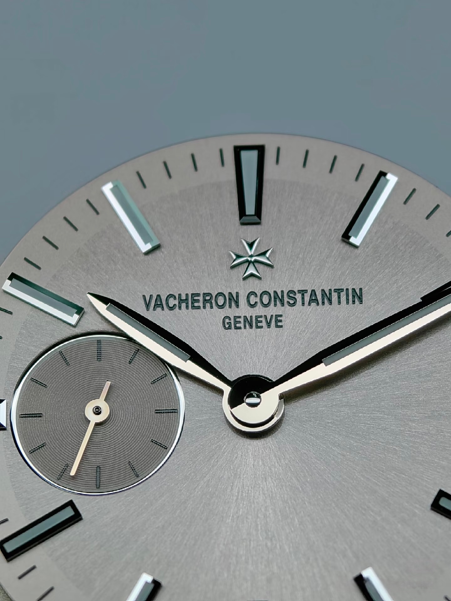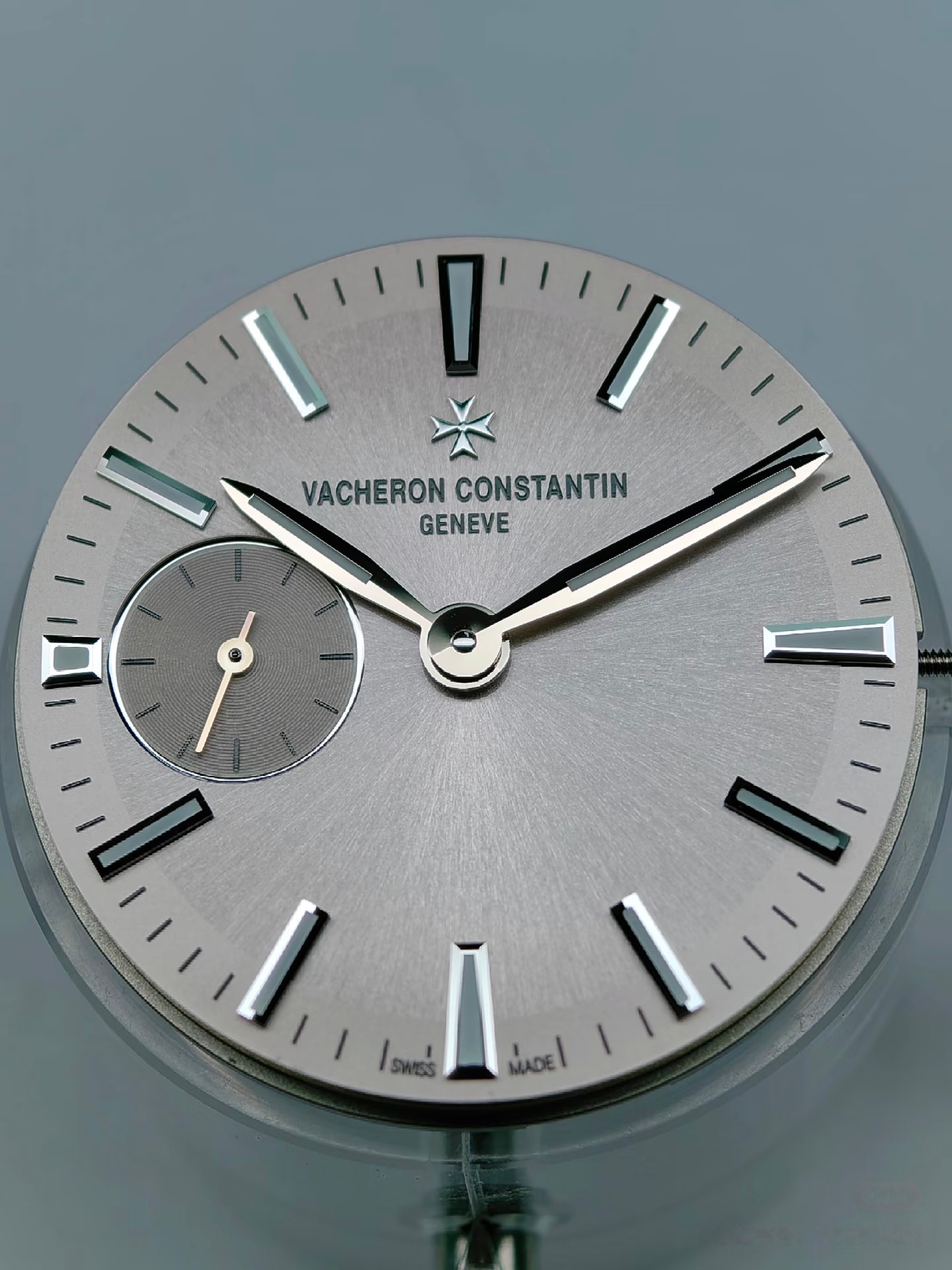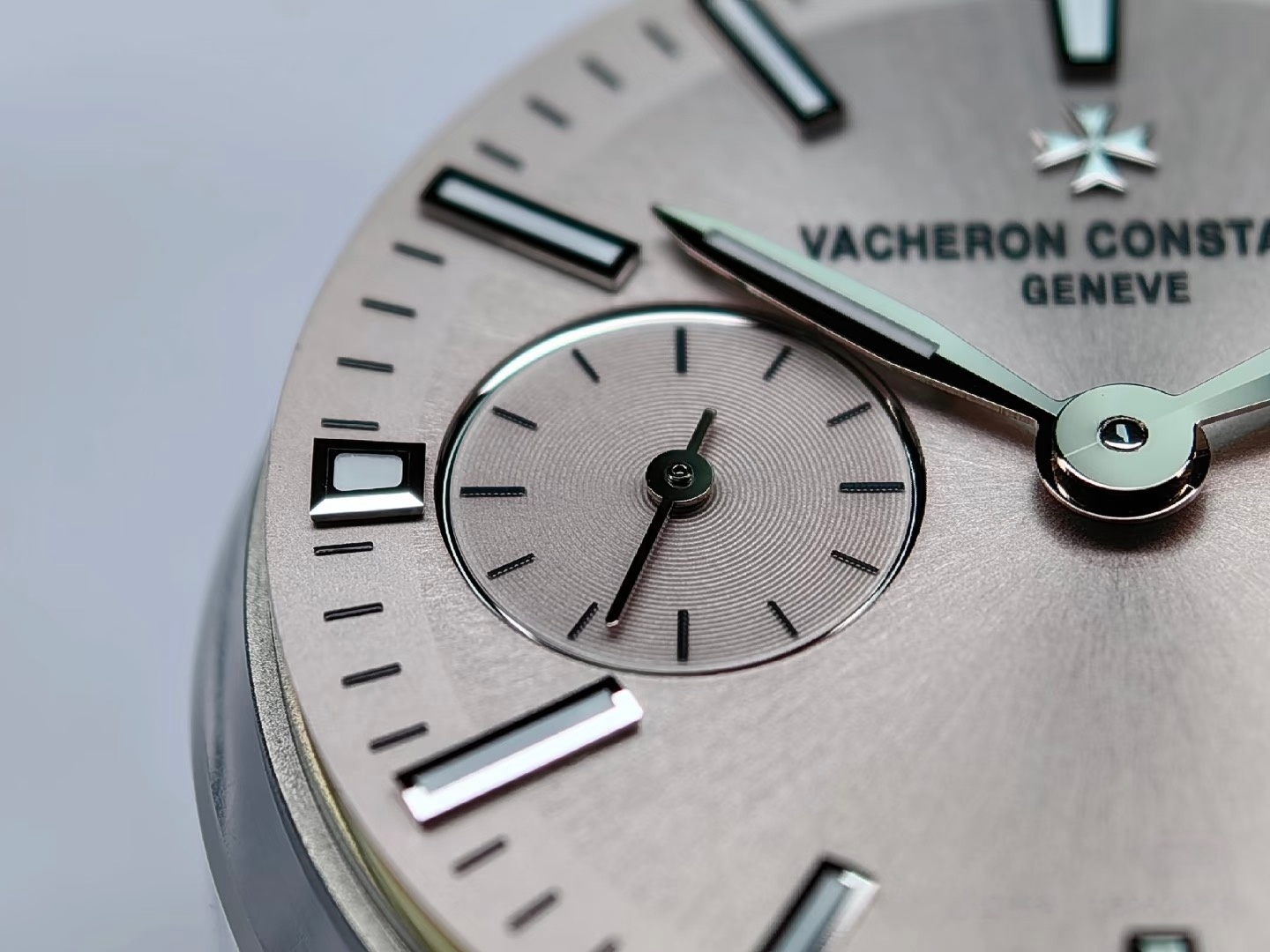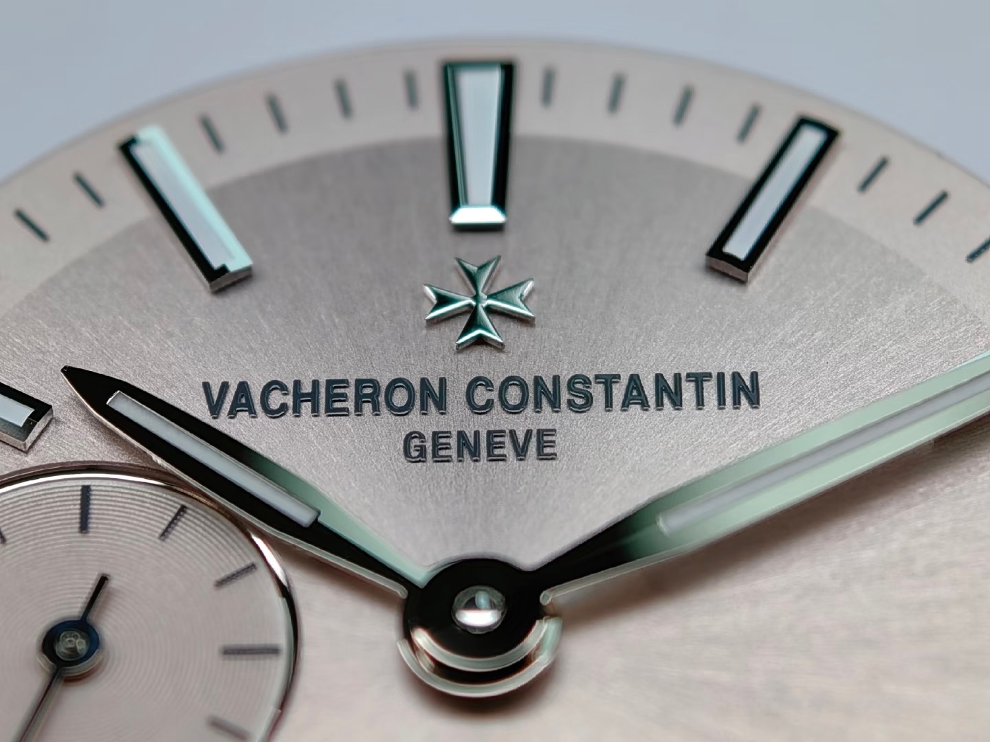 做工方面更是精益求精,每一处细节都彰显着顶级制表工艺的严谨与考究。盘面以光面为基底,叠加细腻的旭日纹缎面拉丝处理,两种工艺的碰撞让盘面既有光滑的细腻触感,又有拉丝纹理的立体层次,避免了单一工艺的单调感。分钟刻度圈经过特殊打磨,呈现出天鹅绒般的光滑质感,与拉丝盘面形成鲜明对比,视觉上更具层次感。时标采用18K金材质打造,经过精细的抛光打磨,表面光滑如镜,折射出柔和的金属光泽,同时涂覆白色夜光涂层,不仅与玫瑰粉盘面形成和谐搭配,更能在昏暗环境下清晰读时,兼顾美观与实用性。9点位的小秒盘设计简洁规整,盘面同样采用与主盘面一致的工艺处理,边缘经过圆润打磨,与主盘面衔接自然,没有丝毫突兀感,整体布局平衡对称,尽显复古雅致的格调,每一道打磨痕迹都经过严格把控,无任何瑕疵,完美诠释了江诗丹顿对细节的极致追求。