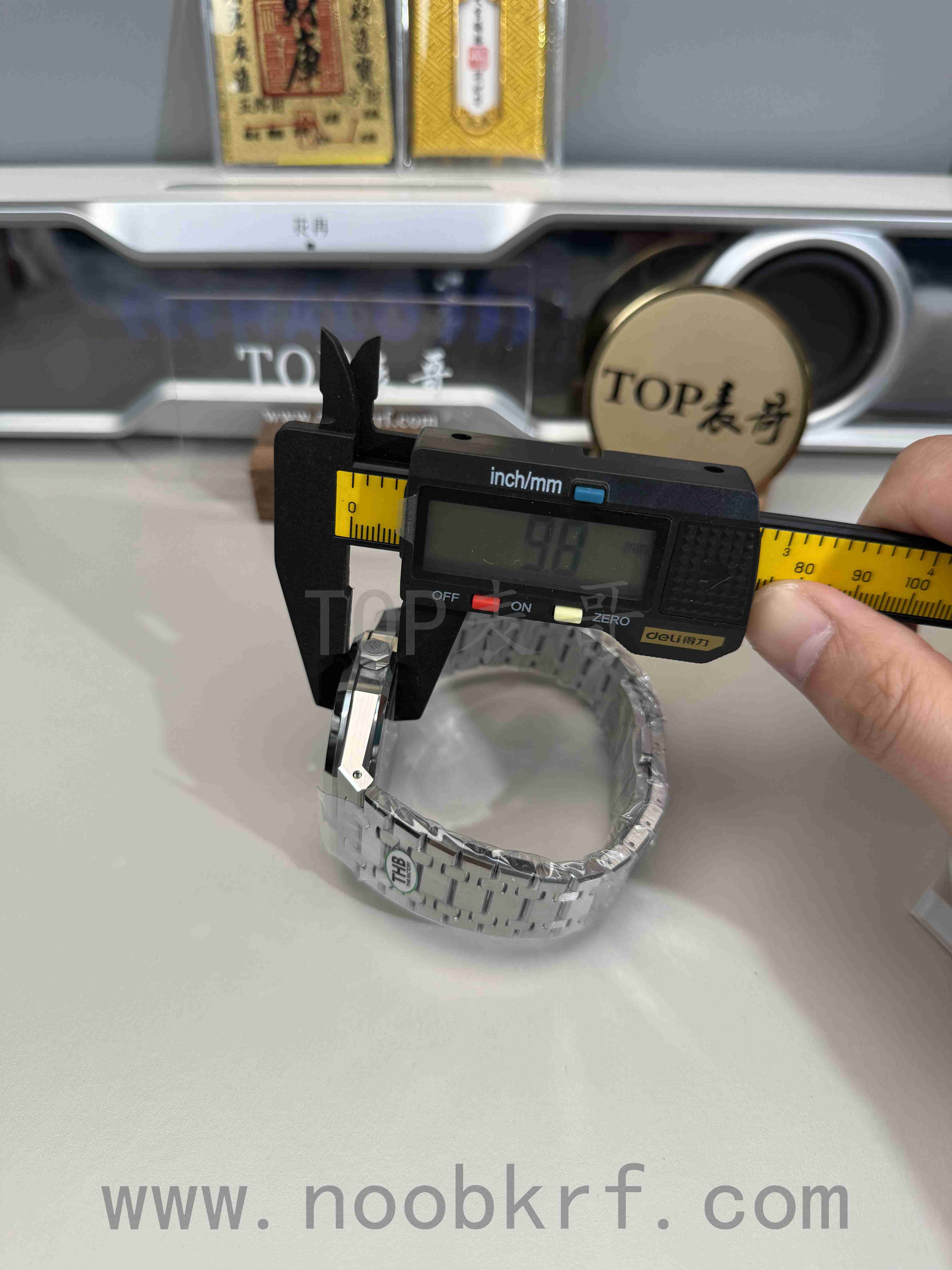 爱彼的皇橡设计由尊达大师操刀,除了一体式表带的特点外,舒适度也是一大法宝,所以必须严格控制表壳的厚度。可以看到采用八颗六角螺丝锁定的一体式表壳能很好的降低底盖厚度,大三针控制在10.1MM,在透底的情况下这个数据是非常优秀的。