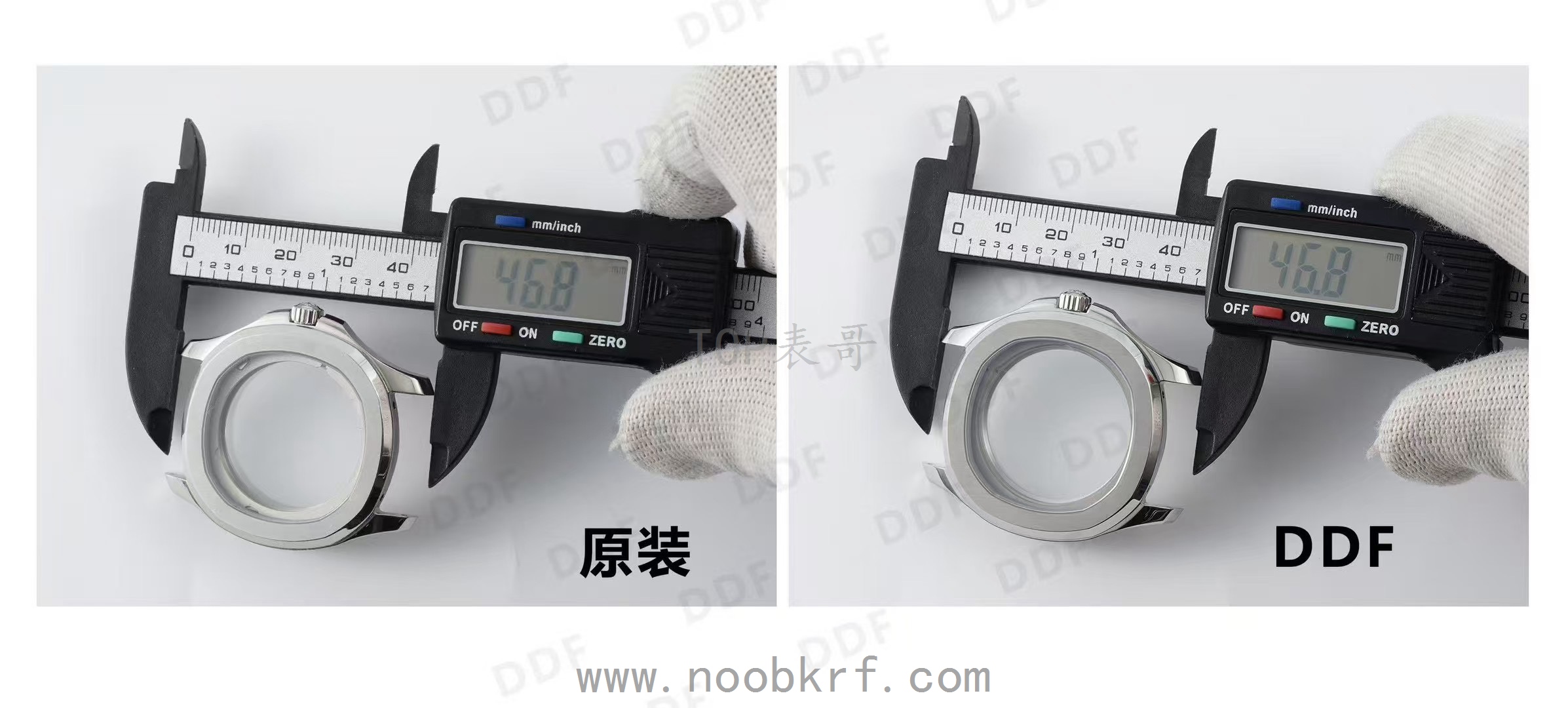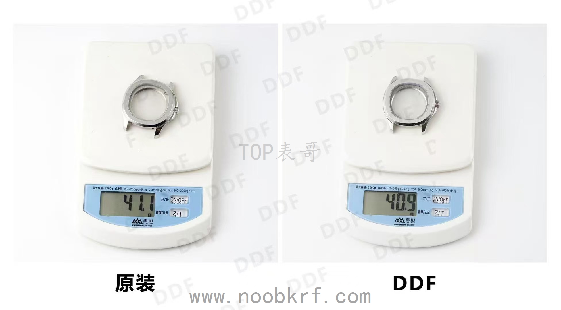DDF 版本:重量 40.9g,仅比原装轻 0.2g,材质选用优质 316L 不锈钢,在重量控制上几乎与原装一致,佩戴时的质感差异微乎其微。