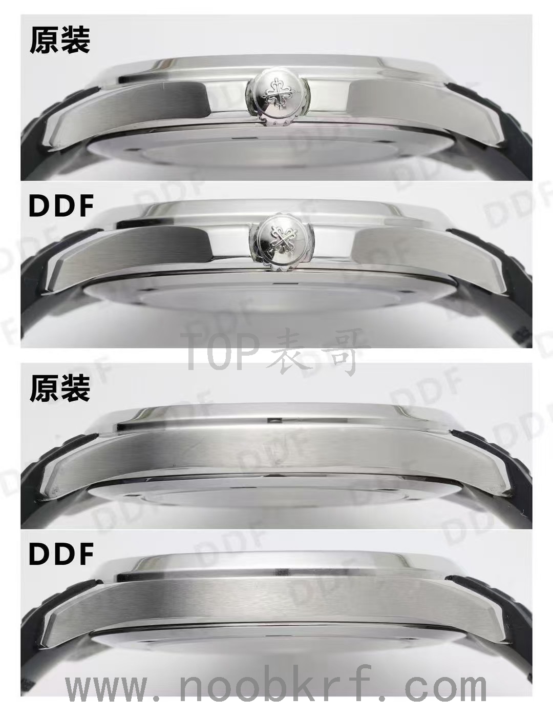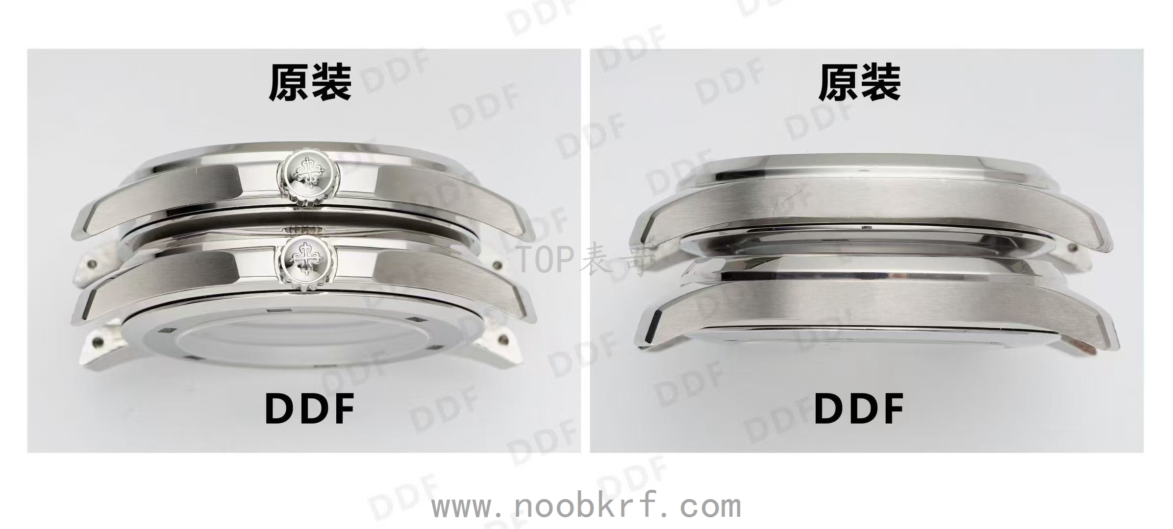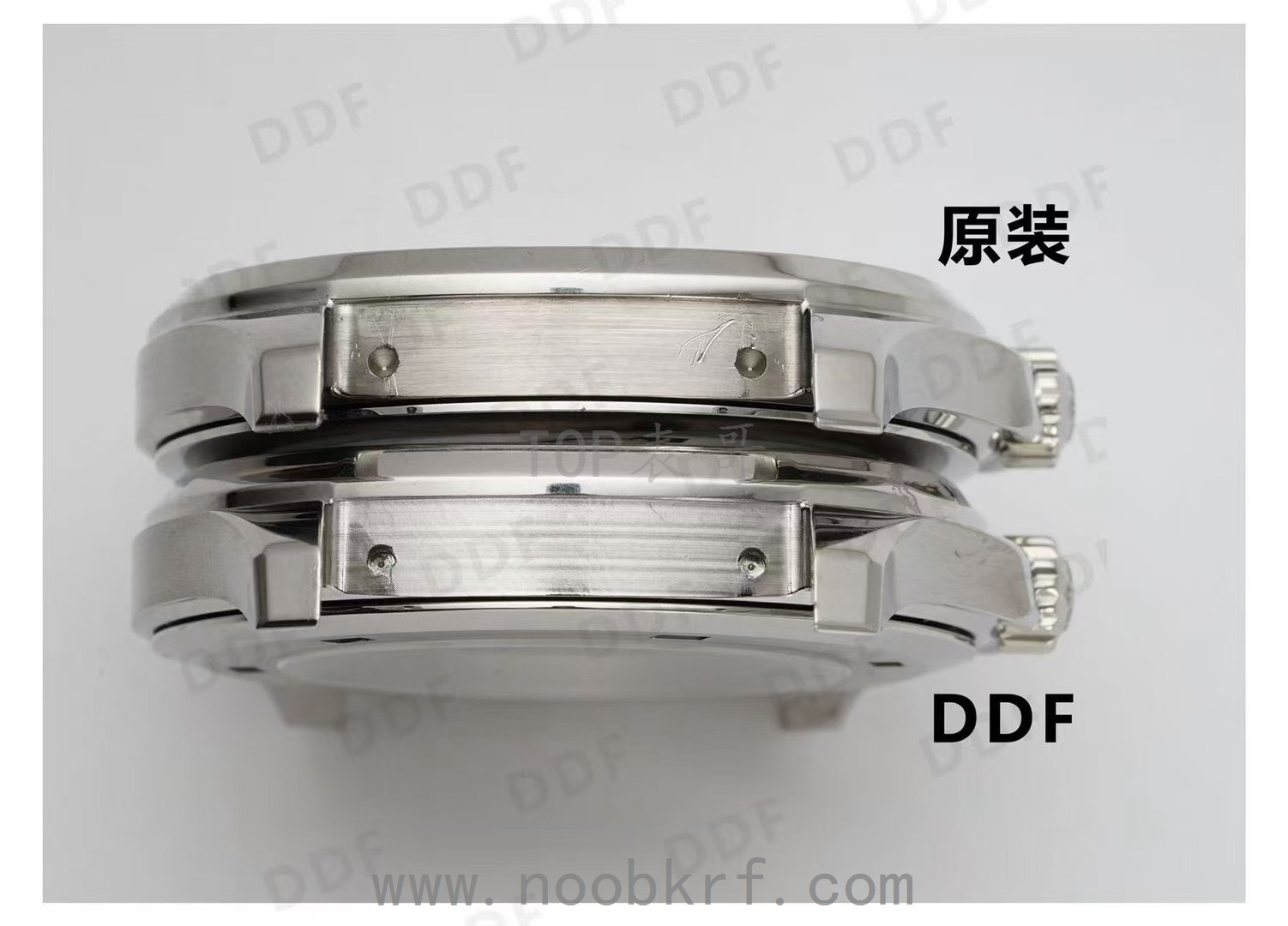 表壳侧面:原装表壳的凹槽和衔接处处理更精致,DDF 表壳在这些细节上的还原度很高,肉眼几乎难以分辨差异。
