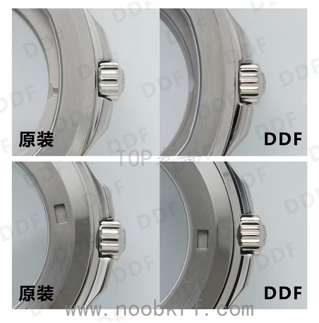 DDF 版本:表冠标志雕刻已非常接近原装,细节锐度和立体感上稍有不足;表壳侧面的工艺处理细腻,整体视觉效果与原装差异极小。