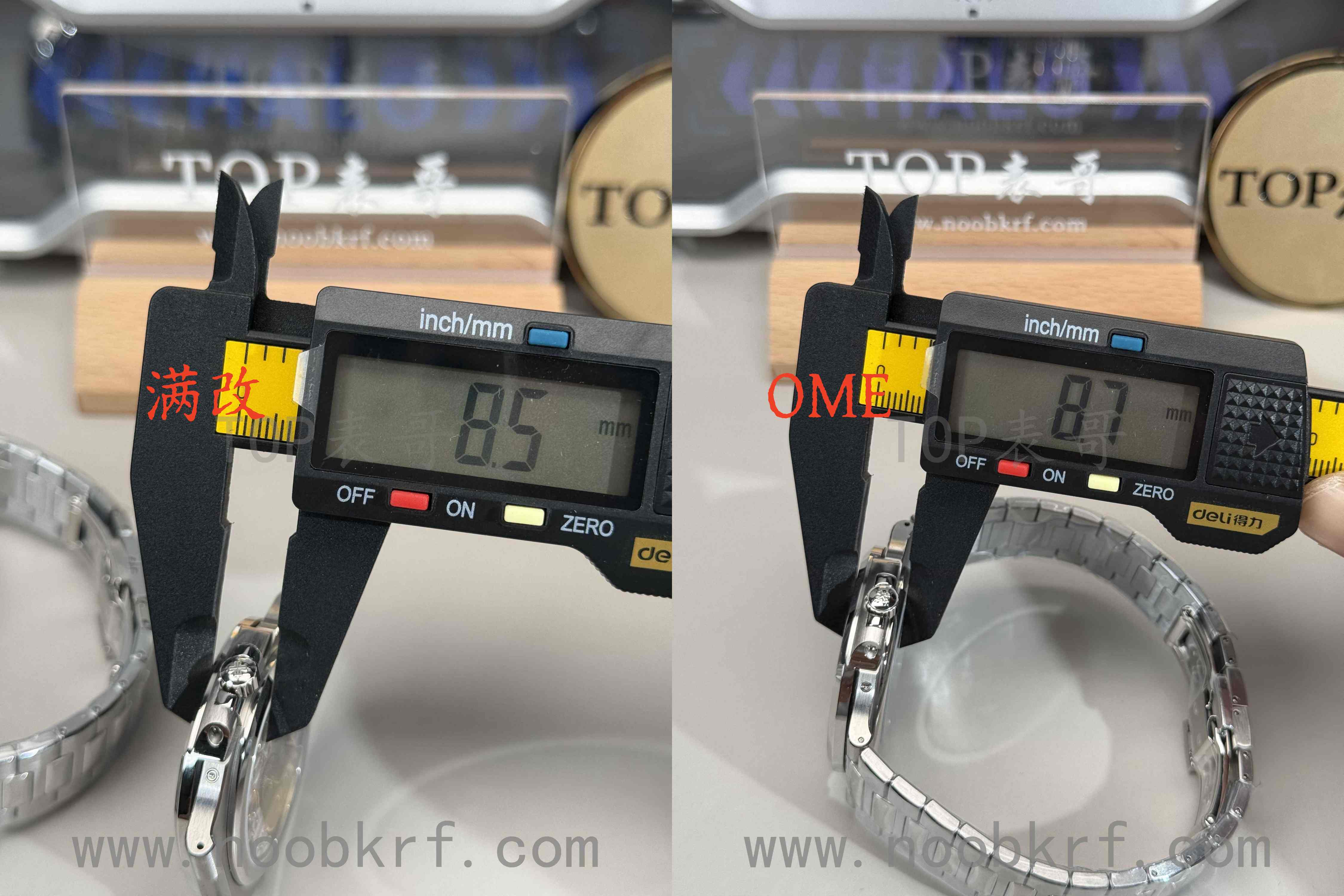表壳方面OME工厂的5712厚度实测为8.7毫米,而PPF工厂的5712厚度为8.9毫米,满改的5712CNC表壳厚度同步原版的8.52毫米。在厚度方面,OME就要比PPF的对版很多,另外就是表耳的鸟嘴方面,OME这方面做到对版,十分不错。