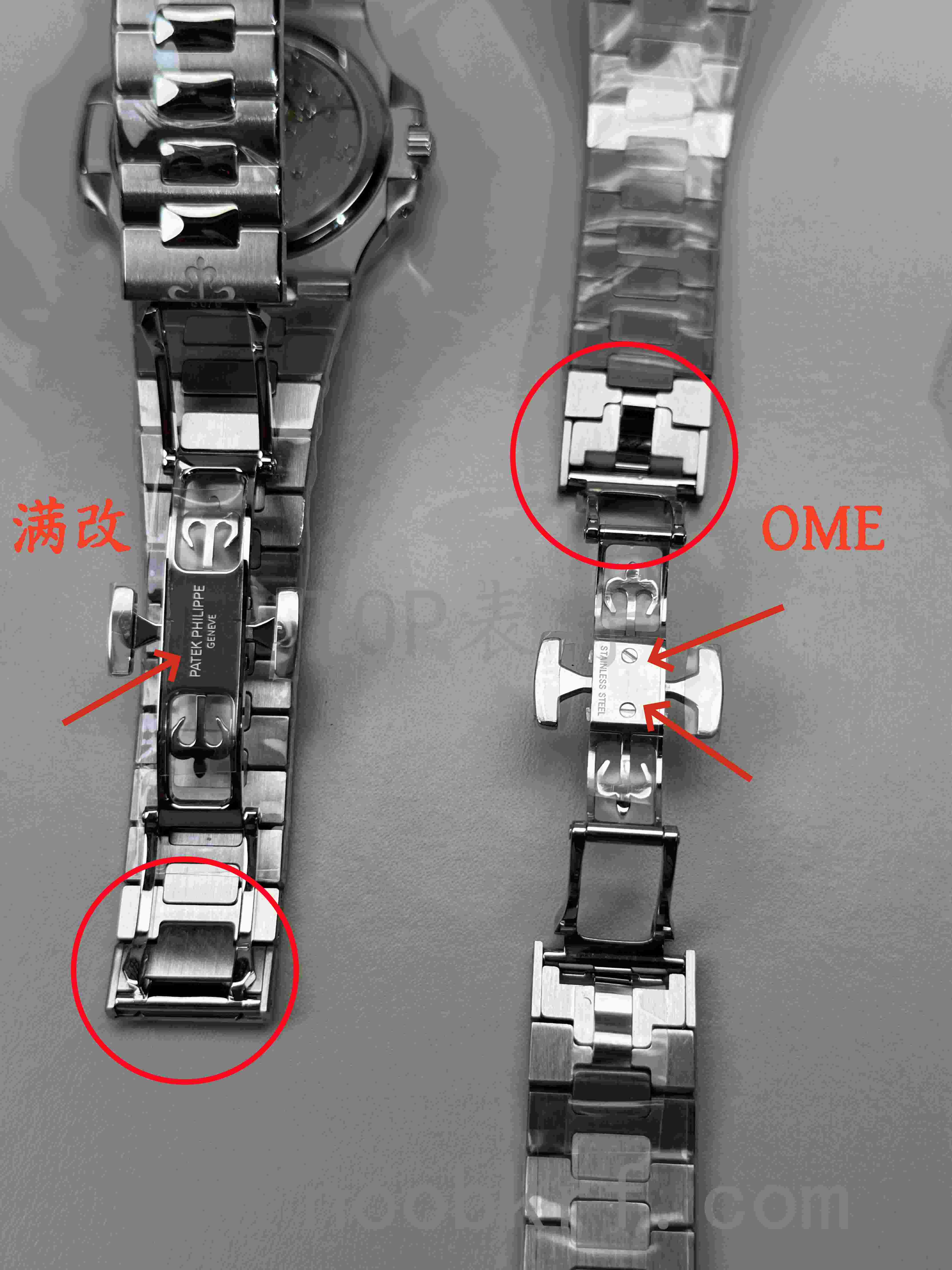 最后就是一个非常关键但是大家又很容易忽略的一点就是在表扣方面,OME工厂虽然是新版本的表扣,不过是不对版的,表扣中段的大小形状不对,中间的英文logo也是完全不对位,并且OME的表扣是没有微调的伸缩功能的,这一点反观PPF工厂的v3版本和CNC表壳的新版表扣则是做到对版的,下图中表哥给大家标注出来。